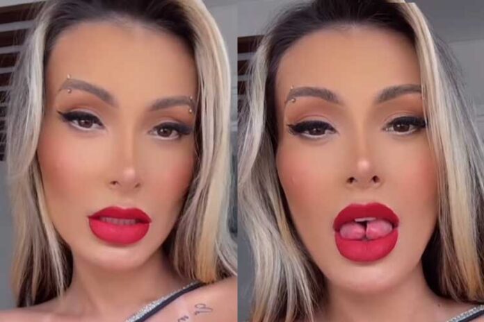 + Andressa Urach divide língua em duas e mostra resultado chocante
