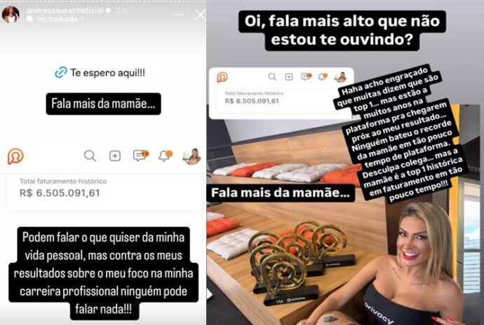 “Podem falar o que quiserem da minha vida pessoal, mas contra os meus resultados sobre o meu foco na carreira profissional ninguém pode falar nada”, afirmou em seu Stories. Além disso, Andressa disse ser recordista na plataforma, batendo recorde de faturamento.
