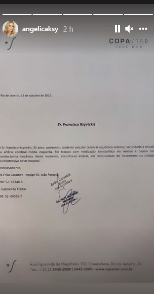 Nestas terça-feira, 12, a loira atualizou os fãs e seguidores sobre o estado de saúde do pai. Através de seu instagram na ferramenta dos Stories, a apresentadora postou o boletim médico com as informações.
