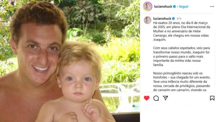 Através das redes sociais, Huck celebrou, publicando diversas fotos ao lado do filhão: “Há exatos 20 anos, no dia 8 de março de 2005, em pleno Dia Internacional da Mulher e no aniversário de Hebe Camargo, ele chegou em nossas vidas: Joaquim. Com seus cabelos espetados, veio para transformar nosso mundo. Joaquim foi o primeiro passo para o salto mais importante da minha vida: nossa família. Nosso primogênito nasceu sob os holofotes – sua chegada foi um evento. Teve uma infância muito diferente da nossa, cercada de privilégios, passando de camarim em camarim, vivendo os bastidores da TV como poucos. Uma receita que poderia ter desandado.
