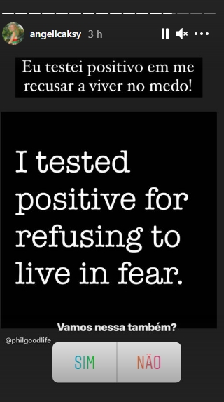 Sempre atenta as redes sociais, através de seu Instagram na ferramenta dos Stories, a apresentadora compartilhou um clique com uma mensagem sobre viver tentando deixar o medo de lado, a foto dizia: “Eu testei positivo em me recusar a viver no medo”.