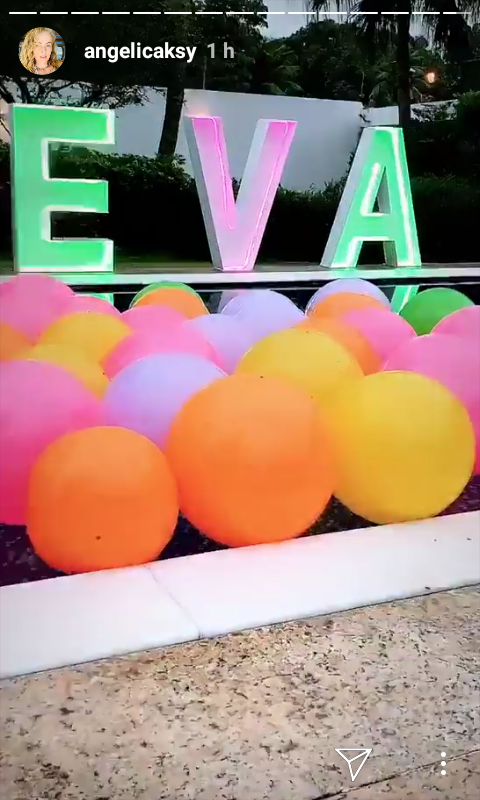 Nas imagens de Angélica, uma piscina está decorada com bolas coloridas e o nome de Eva em um letreiro enorme e iluminado nas cores rosa e verde.