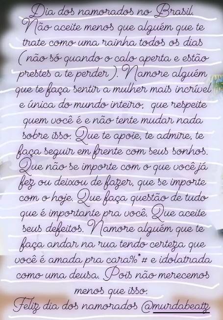 Logo em seguida a cantora já pergunta: ”Cadê meu presentes?”, e os dois entram em um clima de brincadeira na cama. Depois a empresária escreveu um storie no qual faz uma declaração para o namorado: ”Dia dos namorados no Brasil. Não aceite menos que alguém que te trate como uma rainha todos os dias (não só quando o calo aperta e estão prestes a te perder). Namore alguém que te faça sentir a mulher mais incrível e única do mundo inteiro, que respeite quem você é e não tente mudar nada sobre isso. Que te apoie, te admire, te faça seguir em frente com seus sonhos. Que não se importe com o que você já fez ou deixou de fazer, que se importe com o hoje. Que faça questão de tudo que é importante para você. Que aceite seus defeitos. Namore com alguém que te faça andar na rua sabendo que você é amada para cara%*# e idolatrada como uma deus, pois não merecemos menos que isso. Feliz dia dos namorados, Murda Beatz”, falou a cantora.