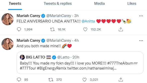 “Quando eu estava crescendo, Mariah era meu ídolo, todos os meus fãs sabem disso. Eu amo ela. Tão poderosa, e sua voz, e tudo que ela faz… Não sei, só amo ela”, afirmou Anitta à publicação, na época.