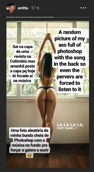 Em um story no Instagram, a própria cantora se pronunciou sobre o assunto, rebatendo de uma vez por todas: “Uma foto aleatória da minha bunda cheia de Photoshop com a música no fundo pra forçar a galera a ouvir”, confessou.
