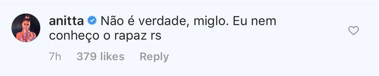 No Instagram, o blogueiro e jornalista Hugo Gloss postou a informação da possível parceria e nos comentários, a artista brasileira aproveitou para esclarecer essa história.