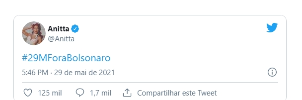 Anitta deixou claro seu posicionamento e sempre que pode costuma se posicionar sobre fatos que acontecem. Essa não é a primeira vez que a artista entra em campanha contra o governo. Em abril deste ano, a popstar entrou na campanha #ForaSalles, que movimentou as redes sociais e incomodou o ministro do Meio Ambiente, Ricardo Salles.