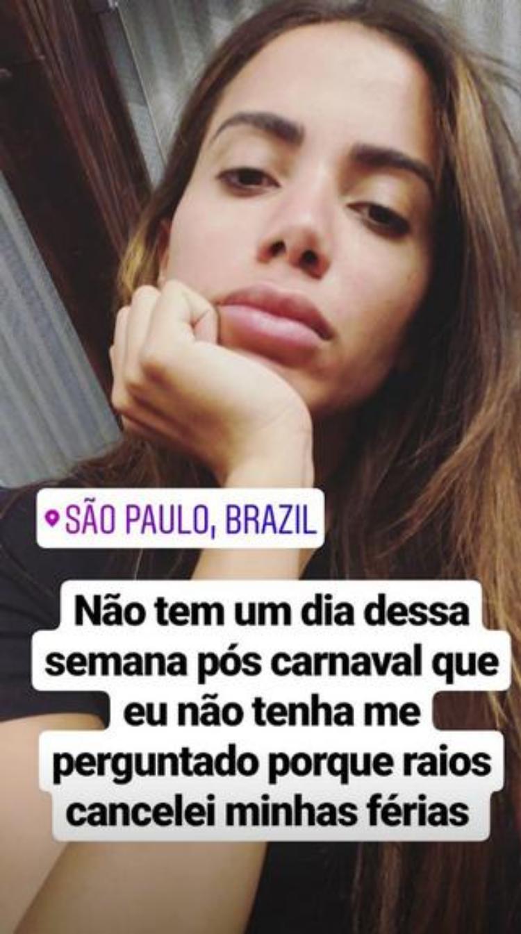 “Não tem um dia desse pós-Carnaval que eu não tenha me perguntado porque raios cancelei minhas férias. Não que eu não saiba o motivos. Mas ‘óia’, te falar viu. Fácil não está. Quase tatuando um ‘vai valer a pena’ na minha testa para ver se ajuda”, escreveu ela em seu stories.