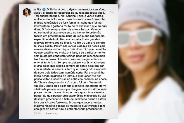 Anitta conclui que também sofreu bastante preconceito no início de sua carreira: “Eu quis passar uma experiência minha, que eu vivi, de muito preconceito e falta de aceitação quando estava fora dos círculos funkeiros. Espero que você entenda. Máximo respeito a todas as mulheres que tiveram e tem coragem de cantar funk e enfrentar os preconceitos”, afirmou.