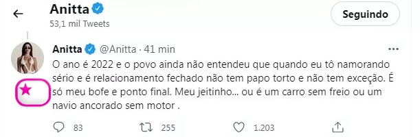 Dessa forma, sem papas na língua, Anitta falou sobre o seu relacionamento e frisou que ‘quando está namorando sério, a relação é fechada’. “O ano é 2022 e o povo ainda não entendeu que quando eu tô namorando sério e é relacionamento fechado, não tem papo torto e não tem exceção”, disparou a cantora que se apresentou há poucos dias no Rock In Rio Lisboa.