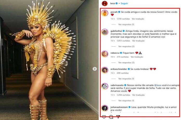 “Se cuida amiga e cuida da nossa Soso!!! Amo vocês!”, disse Pocah. “Nossa rainha tão amada @lexa você é e sempre será rainha. E já é super mamãe da Sofia. Tudo vai dar certo. Amamos vocês!”, afirmou Sabrina Sato. “Amiga, tamo junta. Vem que vem com tudo, Sophia, pra ano que vem ver tua mãe arrasando. Te amo”, comentou Anitta.