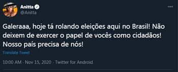 Mais cedo, a cantora já havia falado sobre eleições e incentivou o fãs a não deixarem de votar neste domingo (15). “Galera, hoje tá rolando eleições aqui no Brasil! Não deixem de exercer o papel de vocês como cidadãos! Nosso país precisa de nós!”, escreveu no microblog.