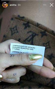 Anitta também exerceu seu papel de cidadã e foi votar. Ela chegou acompanhada do colunista e promoter David Brazil em um colégio do Rio de Janeiro na tarde de domingo. De camiseta branca, Anitta posou para foto e se mostrou animada. No stories do Instagram, ela postou o comprovante de votação exibindo seu nome de batismo, Larissa, e cobrindo o número da seção onde vota.