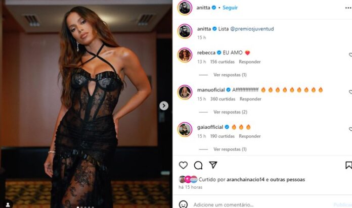 A cantora Anitta esteve presente na premiação internacional ‘Premios Juventud‘, que aconteceu em San Juan, Porto Rico, e arrasou no look, escolhendo um vestido preto com renda e transparência para o evento. Na oportunidade, a brasileira saiu vencedora, levando dois prêmios e rebolando muito ao recebe-los no palco.