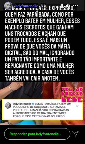 No stories, Fontenelle já havia justificado sua fala. “Paraíba é força de expressão. Quem faz paraibada, como por exemplo bater em mulher, esses machos escrotos que ganham uns trocados e acham que pode tudo. Essa é a mais uma prova de que vocês da máfia digital, são do mal, ignorando um fato tão importante e repugnante como uma mulher ser agredida. A casa de vocês também vai cair anotem”, escreveu.