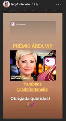 Antonia Fontenelle usou a ferramenta stories de seu Instagram na noite da última terça-feira (22) para agradecer a conquista do título de Youtuber do Ano de 2018, no Prêmio Área VIP