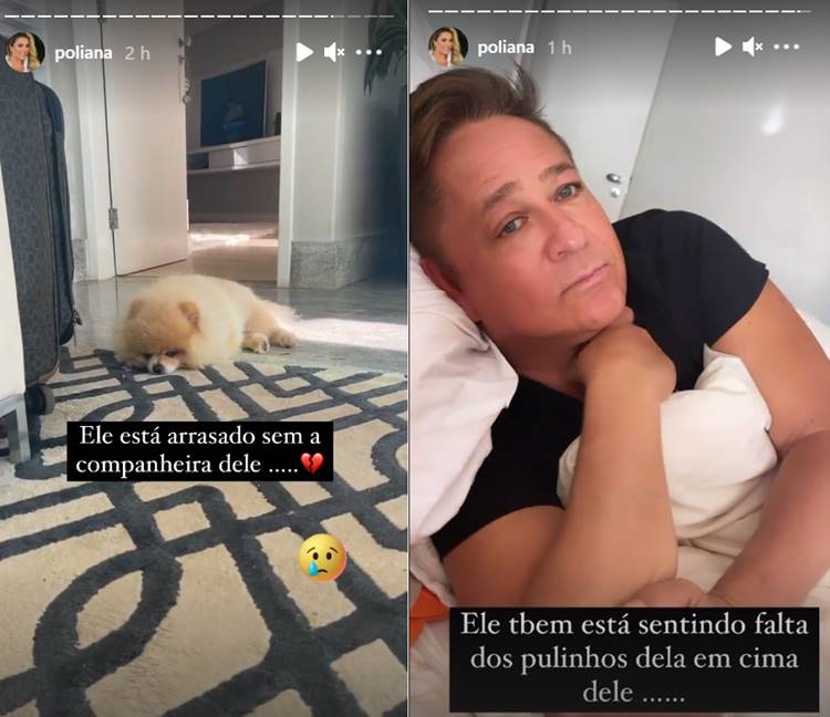 Poliana também mostrou a tristeza do seu outro cachorrinho, Romeu que está sentindo a falta de Petra. Leonardo também surge triste em um outro vídeo, com a legenda: “Ele também está sentindo a falta dos pulinhos dela em cima dele“.