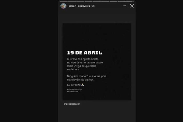 No texto, ele fala sobre a inveja e deixa claro que ninguém irá roubar o seu brilho. “O brilho do Espírito Santo na vida de uma pessoa causa mais inveja do que bens materiais. Ninguém roubará a sua luz, pois ela provém do Senhor. Eu acredito”, escreveu.