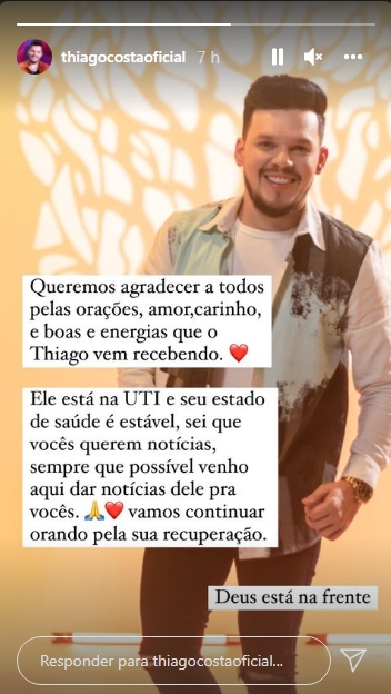 A assessoria do cantor sertanejo Thiago Costa foi até as redes sociais neste sábado e através dos stories atualizou o quadro de saúde do artista.