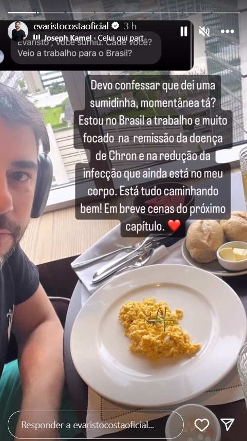 “Devo confessar que dei uma sumidinha, momentânea, tá? Estou no Brasil a trabalho e muito focado na remissão da doença de Chron e na redução da infecção que ainda está no meu corpo”, explicou. Por fim, o jornalista complementou: “Está tudo caminhando bem! Em breve cenas dos próximos capítulos”.