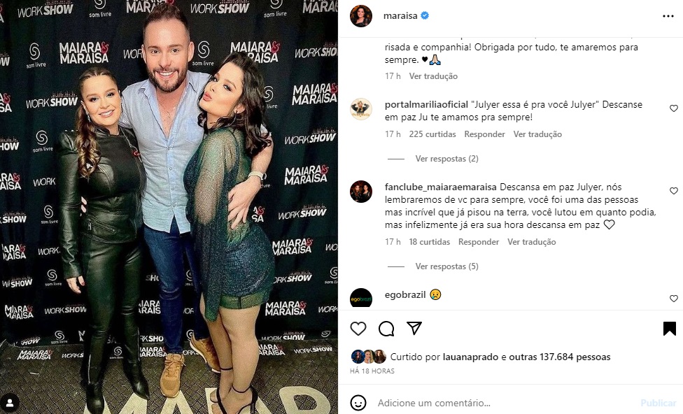 Maraisa, por meio de uma publicação, lamentou a morte do seu maquiador Julyer. Nesta sexta-feira, 2 de junho, os fãs da irmã de Maiara fizeram questão de enviar muitas palavras de conforto para a mesma.