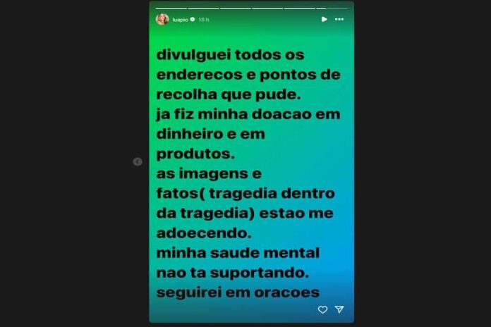 “Divulguei todos os endereços e pontos de recolha que pude. Já fiz minha doação em dinheiro e em produtos. As imagens e fatos (tragédia dentro da tragédia) estão me adoecendo. Minha saúde mental não tá suportando. Seguirei em orações”, afirmou.