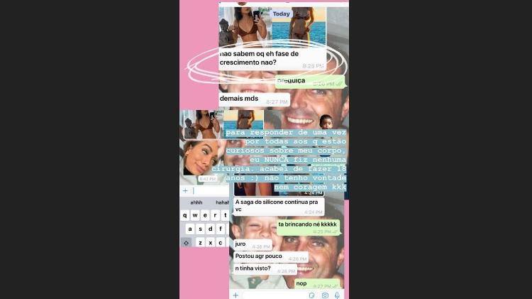 Através do Stories do Instagram, a influencer que está com 18 anos de idade postou uma conversa que teve com uma amiga através de um aplicativo de conversa, assim que soube dos boatos, e comentaram sobre os questionamentos dos internautas sobre os seus seios.