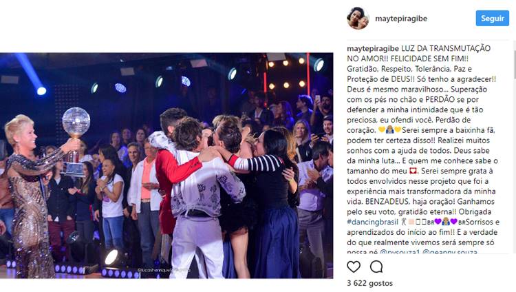Maytê, então, continuou a publicação, destacando os nomes de pessoas que compartilharam o momento de sua vitória na atração. “Realizei muitos sonhos com a ajuda de todos. Deus sabe da minha luta… E quem me conhece sabe o tamanho do meu coração. Serei sempre grata à todos envolvidos nesse projeto que foi a experiência mais transformadora da minha vida. BenzaDeus, haja oração! Ganhamos pelo seu voto, gratidão eterna!! Obrigada Dancing Brasil. Sorrisos e aprendizados do início ao fim!! E a verdade do que realmente vivemos será sempre só nossa né Paulo Victor Souza, Geanny Souza, Maria Pericás, Fenelon Piragibe, Mayra Piragibe e Teresa Piragibe. Obrigada, Brasil!”, concluiu ela no post.