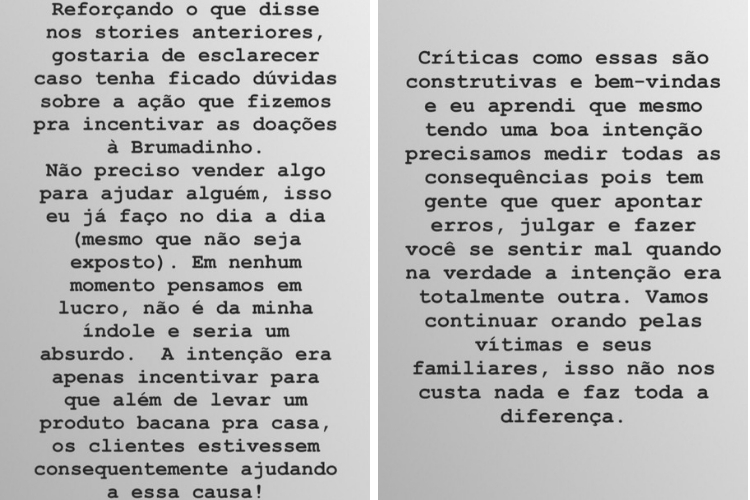 “A intenção era apenas incentivar para que além de levar um produto bacana pra casa, os clientes estivessem consequentemente ajudando essa causa! Críticas como essas são construtivas e bem-vindas e eu aprendi que mesmo tendo uma boa intenção precisamos medir todas as consequências pois tem gente que quer apontar erros, julgar e fazer você se sentir mal quando na verdade a intenção era totalmente outra. Vamos continuar orando pelas vítimas e seus familiares, isso não nos custa nada e faz toda a diferença”, finalizou