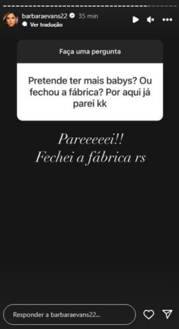 Através de sua conta oficial do Instagram Stories, a ex-peoa resolveu abrir uma caixinha de perguntas para interagir com os seguidores. Ela recebeu a seguinte pergunta de uma de suas fãs: ”Pretende ter mais babys? Ou fechou a fábrica? Por aqui já parei”, enfatizou. Ao responder o questionamento, Bárbara disse: ”Pareeeeei!! Fechei a fábrica, rs”, declarou a ex-A Fazenda. Confira!