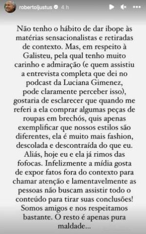 “Não tenho o hábito de dar ibope às matérias sensacionalistas e retiradas de contexto. Mas, em respeito à Galisteu, pela qual tenho muito carinho e admiração (e quem assistiu a entrevista completa que dei no podcast da Luciana Gimenez, pode claramente perceber isso). Mas, gostaria de esclarecer que quando me referi a ela comprar algumas peças de roupas em brechós, quis apenas exemplificar que nossos estilos são diferentes, ela é muito mais fashion, descolada e descontraída do que eu“, iniciou ele.