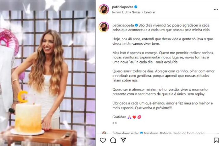 Patrícia Poeta começou seu texto afirmando que só tem a agradecer: “365 dias vivendo! Só posso agradecer a cada coisa que aconteceu e a cada um que passou pela minha vida. Hoje, aos 48 anos, entendi que dessa vida a gente só leva o que viveu, então vamos viver bem”, iniciou ela no feed do instagram.