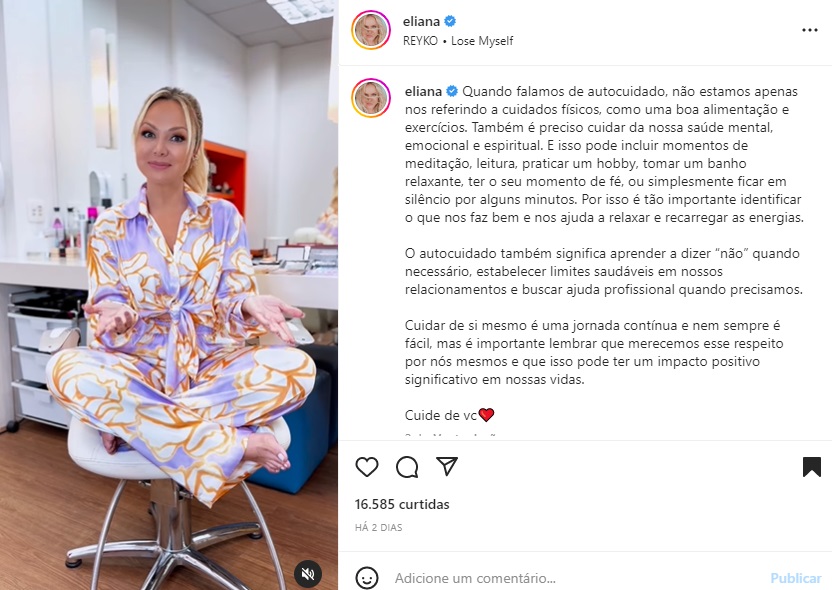 A apresentadora, ainda, refletiu: “O autocuidado também significa aprender a dizer “não” quando necessário, estabelecer limites saudáveis em nossos relacionamentos e buscar ajuda profissional quando precisamos. Cuidar de si mesmo é uma jornada contínua e nem sempre é fácil, mas é importante lembrar que merecemos esse respeito por nós mesmos e que isso pode ter um impacto positivo significativo em nossas vidas. Cuide de vc”.