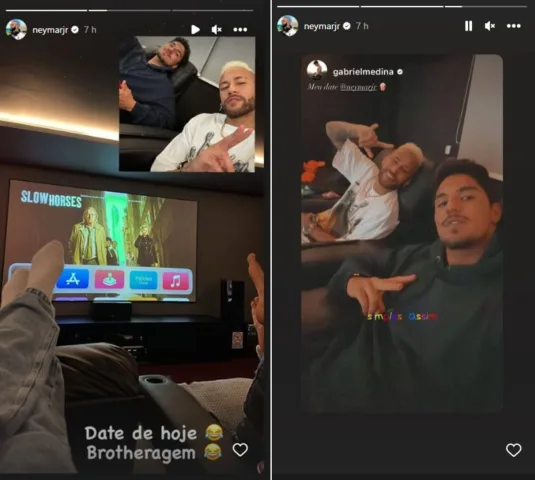 Na foto que postou em sua conta oficial do Instagram Stories, o astro do futebol brasileiro apareceu ao lado de Gabriel assistindo a série ‘Slow Horses’. Na legenda da imagem Neymar escreveu o seguinte: ”Date de hoje. Brotheragem.”, disse. Já Medina postou: ”Meu date @neymarjr. Simples assim.”