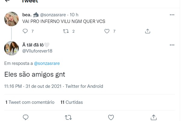 Sendo assim, no Twitter, alguns seguidores chegaram a comentar os stories da cantora. “Vai para o inferno, ViLu (apelido do ex-casal Luísa e Vitão). Ninguém quer vocês”, se revoltou uma internauta. “Eles são amigos, gente”, disse outra, que recebeu uma curtida da cantora.