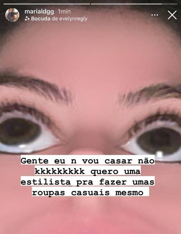 “Gente, eu não vou casar, não.”, nega a jovem logo a princípio. ”Quero uma estilista para fazer umas roupas casuais mesmo.“, explicou logo na sequência Maria Lina em seus Stories do Instagram. Vale lembrar, no entanto, que até o momento, as redes sociais da felizarda é trancado. Mas nós tiramos um print para você!