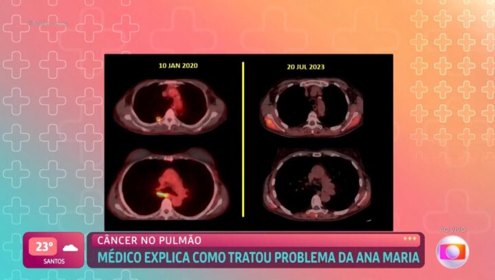 Ele revelou que, na época, as chances de cura eram de apenas 10% a 20%. No entanto, graças à evolução no tratamento com imunoterapia, o resultado foi positivo. “O nódulo pulmonar some, os gânglios do mediastino somem. As adrenais somem completamente. O pontinho no cérebro também sumiu completamente. Agora, as chances de cura subiram muito. Em três anos e meio, com resposta completa, as chances já vão para 90%”, comemorou a apresentadora.