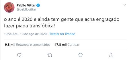 “O ano é 2020 e ainda tem gente que acha engraçado fazer piada transfóbica!”, escreveu Pabllo na rede social.
