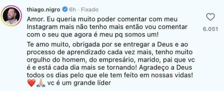 O que aconteceu foi que a coach utilizou a conta do Instagram do próprio marido para comentar uma publicação feita por ele recentemente. Thiago, que fez um retiro, exibiu o momento onde reencontrou a companheira e fez algumas reflexões sobre a vida. Ele inicia: ”Eu vivi 33 anos sem saber que era possível chegar nesse nível de amor, honra e unidade. Você tem uma missão, você nasceu e se perdeu na jornada de se tornar um homem inquebrantável, alguém que nasceu para fazer história, por algo muito maior! Nós devemos dar a vida pelos nossos”, disse.