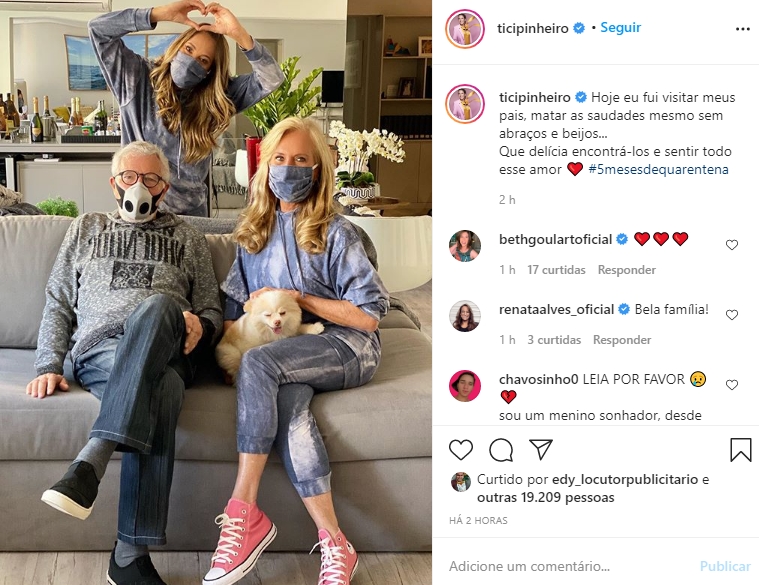 Devido ao covid -19, e seguindo Todas as orientações da (OMS), a loira surgiu junto aos familiares tomando seus cuidados recomendados. A apresentadora e os pais estavam protegidos com máscaras faciais, um dos itens fundamentais para se conter o avanço do vírus. No registro ela aproveitou para falar da saudade que estava sentindo, após ficar 5 meses sem vê-los, devido a pandemia mundial do novo coronavírus.