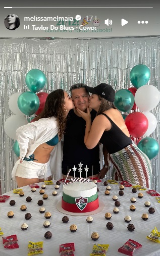Mesmo em meio ao luto e resiliência, a atriz comemorou o aniversário do pai, Luciano Souza. O registro mostra Mel e outra mulher dando um beijo no pai, com a decoração da festa temática do Fluminense, time do coração dele.