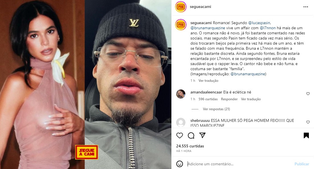 O mesmo, ainda, deixou claro que os dois trocaram beijos pela primeira vez há mais de um ano, e têm se falado com mais frequência. Bruna e L7nnon mantém a relação bastante discreta. “Ainda segundo fontes, Bruna estaria encantada por L7nnon, e se surpreendeu pelo estilo de vida saudável que o rapper leva. O cantor não bebe e não fuma, e costuma ser bastante família”, destacou.