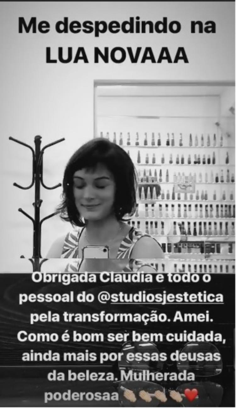 Em seu Stories no Instagram, ela mostrou que adotou um corte de cabelo mais curto, e se mostrou estar orgulhosa com o resultado. “Obrigada Claudia e todo pessoal do Studio-SJ – Saúde e Estética pela transformação. Amo. Como é bom ser bem cuidada, ainda mais por essas deusas da beleza. Mulherada Poderosaa”, escreveu ela. “O cabelo ficou lindo”, disse uma seguidora.