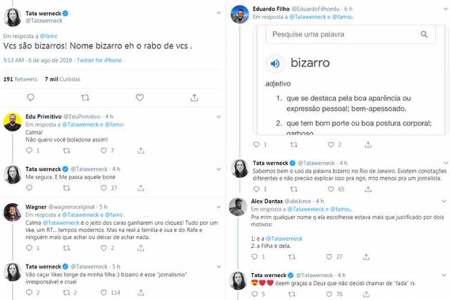 Logo após a resposta de Tatá, uma internauta tentou colocar panos quentes trazendo um significado mais leve para a palavra bizarro, mas pelo jeito não adiantou muito: “Sabemos bem o uso da palavra bizarro no Rio de Janeiro. Existem conotações diferentes e não preciso explicar isso pra ninguém, muito menos pra um jornalista”, disse ela.