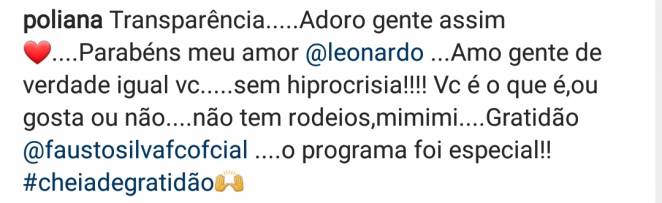 “Transparência…..Adoro gente assim❤️….Parabéns meu amor @leonardo …Amo gente de verdade igual vc…..sem hiprocrisia!!!! Vc é o que é,ou gosta ou não….não tem rodeios,mimimi….Gratidão @faustosilvafcofcial ….o programa foi especial!! #cheiadegratidão”, escreveu ela.