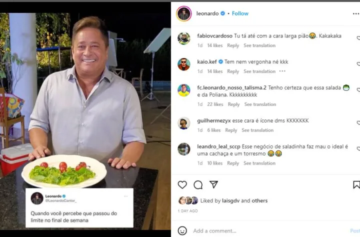 Em suma, um seguidor de Leonardo, ao se deparar com a postagem destacou: “Tem nem vergonha né kkk”, disse, afirmando que o cantor estava mentindo sobre uma suposta dieta. “Tenho certeza que essa salada é da Poliana. Kkkkkkkkkk”, escreveu outro. Até o momento desta publicação, o nome de Leonardo segue sendo um dos mais comentados da web.
