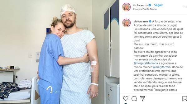 “Eu quero muito agradecer a toda mensagem de carinho, agradecer novamente a toda equipe do @hospitalstamaria e agradecer a minha mulher @marytormin, dona de um profissionalismo incrível, que sozinha, conseguiu manter a calma, controlar meu desespero, mesmo me vendo vomitando sangue, me trouxe até o hospital para realizar todo procedimento! Ficou junto com a equipe de cirurgia e não me abandonou nem um minuto sequer Eu tenho orgulho de você, de quem você é, de tudo que faz por mim! Obrigado por tudo mesmo! Te amo tanto tanto! Essa vida artística é de altos e baixos, bom saber que você está e estará comigo dos 2 lados!“, completou ele.
