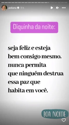 Depois de toda esta confusão, a profissional de comunicação parece ter mandado mais uma indireta ao enteado. Como costuma fazer frequentemente, a sogra de Virgínia gosta de postar reflexões em sua rede social, e desta vez não foi diferente. A profissional de comunicação disse o seguinte em sua conta oficial do Instagram Stories: ”Seja feliz e esteja bem consigo mesmo. Nunca permita que ninguém destrua essa paz que habita em você.”, destacou.