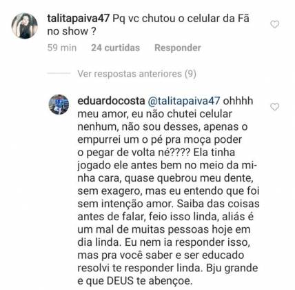 Logo em seguida, o cantor fez questão de esclarecer o que realmente aconteceu no show: “ohhhh meu amor, eu não chutei celular nenhum, não sou desses, apenas o empurrei um o pé pra moça poder o pegar de volta né???? Ela tinha jogado ele antes bem no meio da minha cara, quase quebrou meu dente, sem exagero, mas eu entendo que foi sem intenção amor. Saiba das coisas antes de falar, feio isso linda, aliás é um mal de muitas pessoas hoje em dia linda. Eu nem ia responder isso, mas pra você saber e ser educado resolvi te responder linda. Bju grande e que DEUS te abençoe”, escreveu ele.