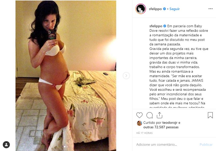 “Meu post deu o que falar e sabem onde ele mais me tocou? Na quantidade de mulheres admitindo isso, se libertando da culpa. Na identificação imediata. Na empatia também daquelas que nem mães são. Não vou admitir que duvidem do amor imensurável que tenho pelas minhas filhas mas vendem a mãe plena e não falam do lado B. A famosa história de uma única versão, com o intuito de nos vender a verdade única e absoluta de ser mãe. E quando a maternidade é idealizada causa sofrimento, impedindo muitas mulheres de aproveitarem o lado realmente bom. Pra mim a maternidade não é linda, lindo é o amor que nasce junto com eles e toda a parceria que é conquistada”, ressaltou.